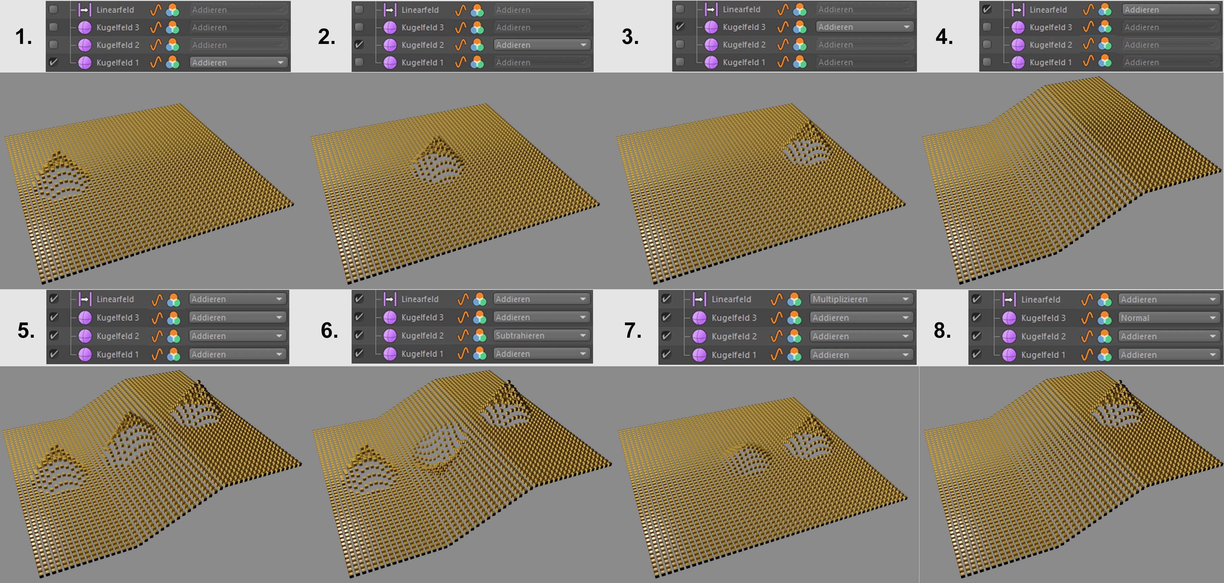 Sie sehen hier ein Matrix-Objekt, das von 4 Feldern beeinflusst wird (die Felder befinden sich in einem Simpel-Effektor, der die Klone um 100cm anhebt; der Wertebeschnitt für die Feldliste von 0%-100% ist ausgeschaltet: Icon rechts unten). Beachten Sie jetzt die verschiedenen Mischmodi (Stärke jeweils 100%).