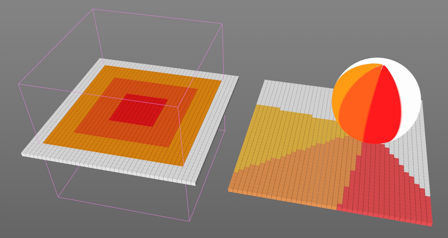 Durch diese vielartigen Feldwirkungen kann ein Feld auch auf viele Bereiche gleichzeitig wirken. In der folgenden Abbildung steuert jeweils 1 Feld ein Vertex-Farben-Tag, das Vertex-Farben-Tag wiederum texturiert über einen Vertex-Map-Shader die Kugel als auch über einen Simpel-Effektor das Einfärben der Matrix.