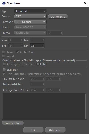 Das sind eine ganze Anzahl Ansichten (die es dann logischerweise jeweils für jedes Bild einer Animation gibt). Je nachdem, welche dieser Ansichten Sie abspeichern wollen, kann das hier ausgewählt werden (voreingestellt ist die im Tab "Stereoskopie" ausgewählte Option).