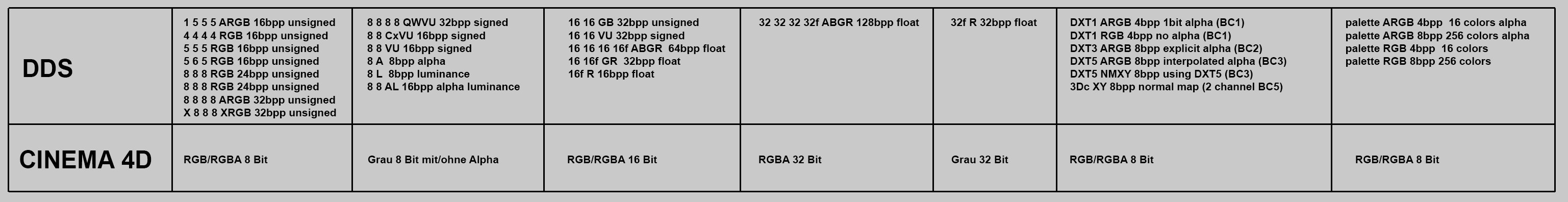 Folgende DDS-Formate werden wie angegeben in Cinema 4D eingelesen: