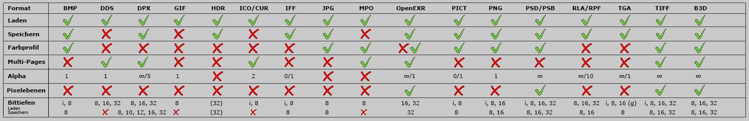 Es werden folgende Bildformate geladen (z.B. als Textur in einem Material) bzw. exportiert (z.B. Ausgabe gerendertes Bild):