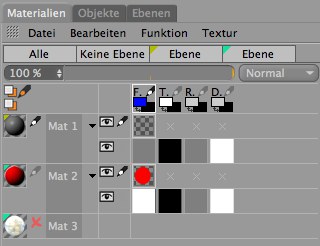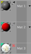 Sie sehen links die die Material-Vorschauen (inkl. der evtl. zugeordnete Ebenenfarbe). Unmittelbar rechts daneben finden Sie kleine Icons in Form von Bleistiften (farbig: dieses Material wird bemalt; ausgegraut: dieses Material wird vom Bemalen ausgenommen) oder Kreuzen (Textur dieses Materials ist nicht geladen).