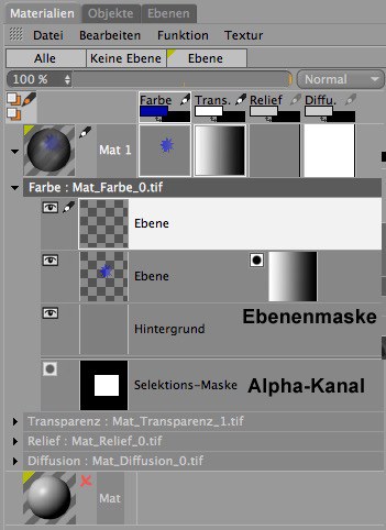 Die rechte Seite des Material-Managers wird von der Darstellung der Material-Kanäle und der Ebenen ausgefüllt. Sollte hier nichts zu sehen sein, müssen Sie erst noch eine Textur über das Textur-Menü erstellen (oder die Texturen laden, siehe Texturen laden/entladen).