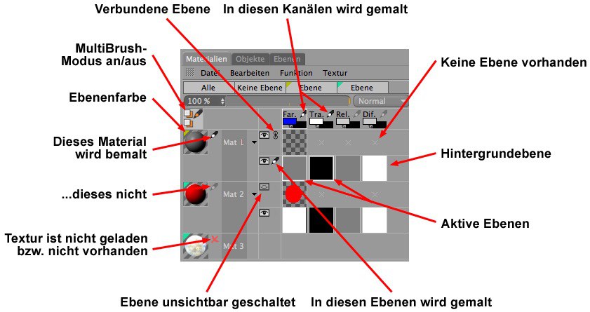 Angenommen, Sie wollen in 7 Material-Kanälen gleichzeitig malen. Jeder dieser Kanäle hat mehrere Ebenen. Um jetzt zu definieren, in welcher Ebene gemalt werden soll, klicken Sie jeweils einmal kurz auf die entsprechende Ebene. Diese wird erst hellrot, wenn Sie dann auf die nächste Ebene klicken, dunkelrot markiert