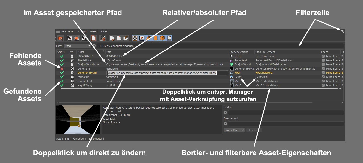 Der Projekt-Asset-Inspektor zeigt alle in der derzeit angezeigten Szene verwendeten Assets inkl. viele ihrer Eigenschaften an. Sie erkennen hier auf einen Blick, ob Assets fehlen und können diese hier neu verknüpfen, austauschen, zusammenführen etc.