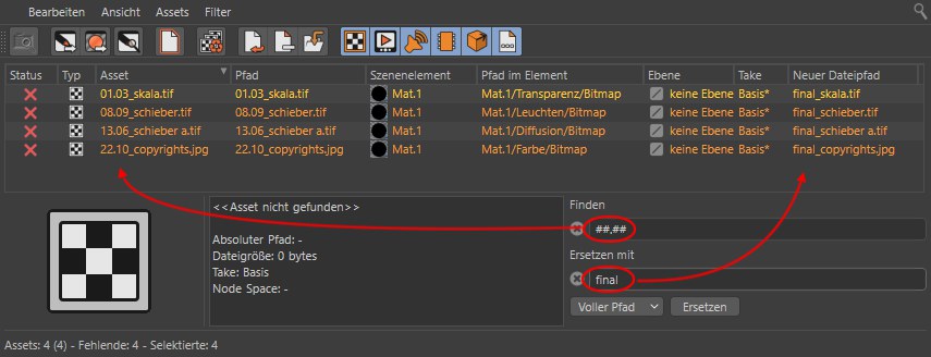 Bei Ersetzen wird also der Teil des alten Pfades (oder Texturnamens) eingesetzt, der mit dem bei Ersetzen mit definierten ersetzt wird. Auf diese Art und Weise können bei vielen Texturen/Assets alte Pfade schnell durch neue ersetzt werden.