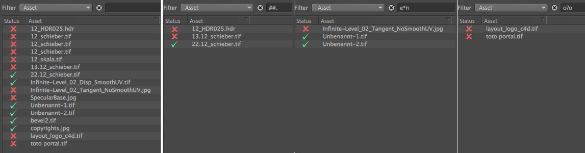 Links sehen Sie die ungefilterte Assetliste, dann Filterung von links nach rechts: