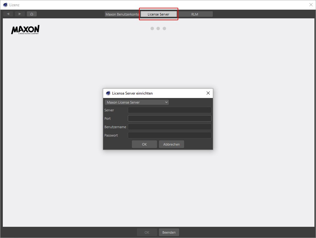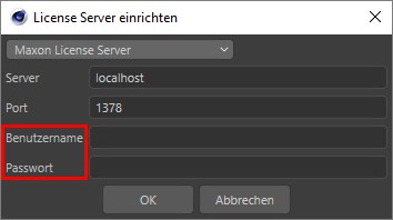 Benutzername und Passwort legen Sie als Administrator im Tab "Benutzer" fest (beides hat nichts mit den Anmeldedaten des Maxon Benutzerkontos zu tun!).