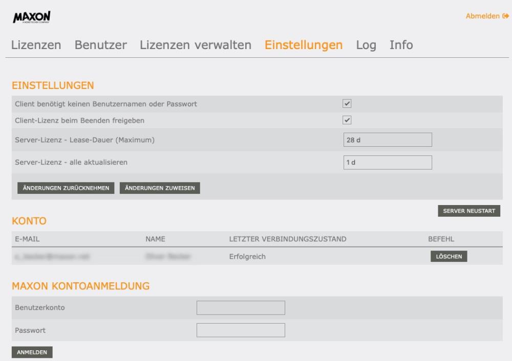 Diese Seite bietet Ihnen neben einigen Detail-Einstellungen die Verknüpfung zwischen Maxon Benutzerkonto und License Server.