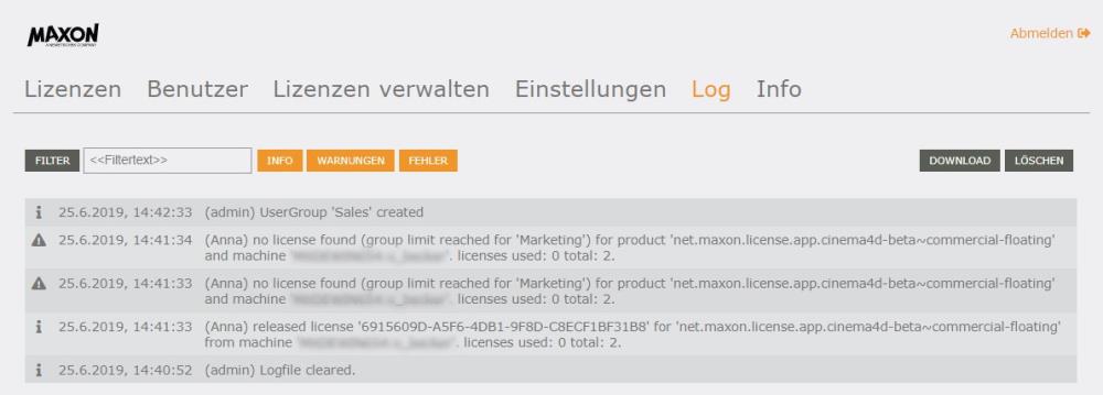 Die Log-Seite bietet Ihnen allerhand Informationen über die Tätigkeit des License Server. Hier wird alles vermerkt, wie z.B. ob Lizenzen zugewiesen wurden, neue Benutzer oder Gruppen erstellt oder gelöscht wurden, irgendetwas schief gegangen ist, etc. Alles von Belang kann hier eingesehen werden