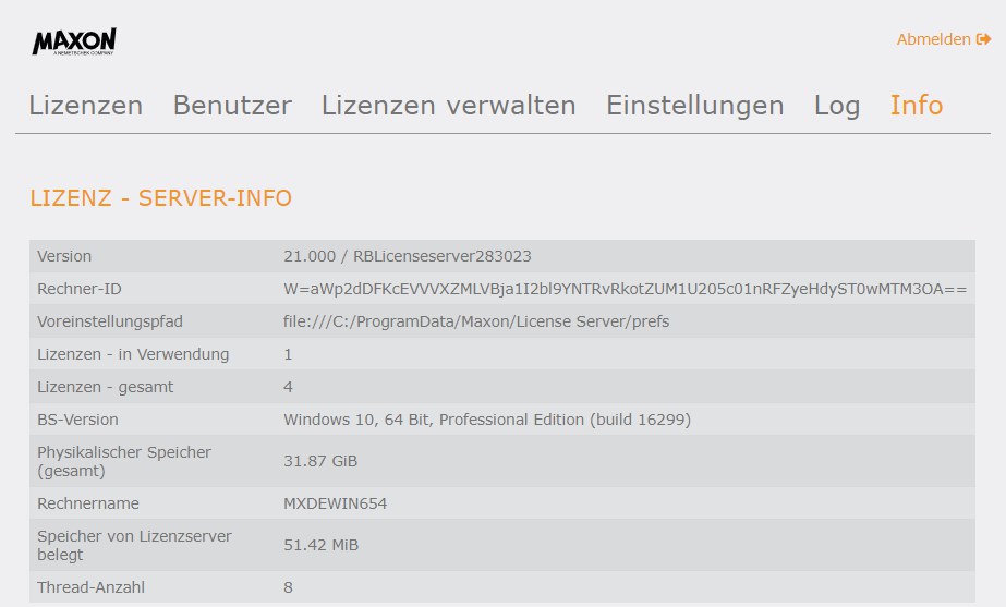 Auf der Infoseite können Sie ausnahmsweise nichts einstellen, sondern nur einige Informationen zum License Server ablesen. Diese sind alle selbsterklärend.