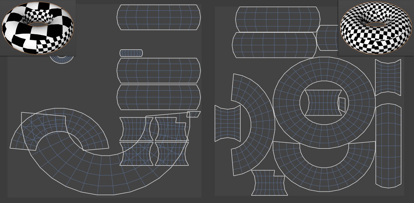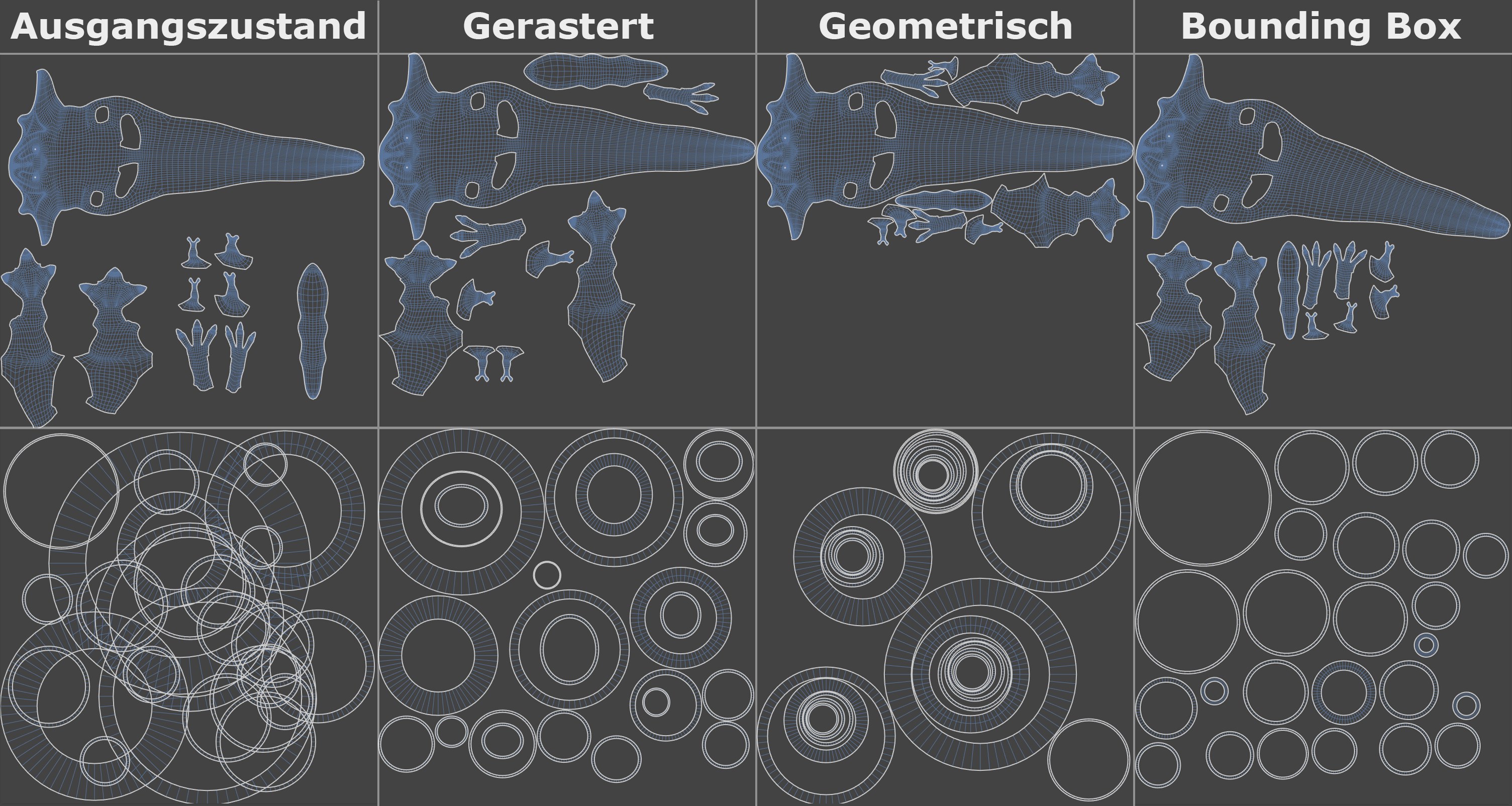 Die 3 UV-Packen-Modi mit verschiedenen UV-Meshes.