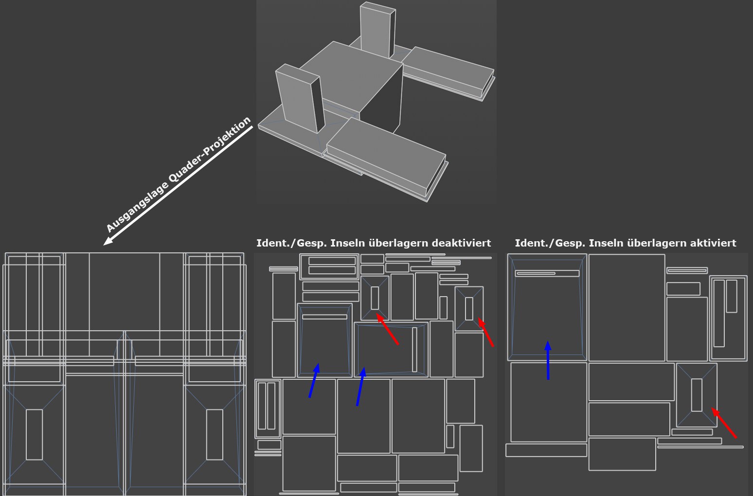 Das in der Abbilddung oben gezeigte Objekt wird zunächst mit einer Quaderprojektion beaufschlagt und dann mittels "UV packen" gepackt. Beachten Sie wie in der mittleren Abbildung unten zunächst keine Rücksicht auf identische bzw. gespiegelte UV-Insel Rücksicht genommen wird und jede Insel ihre eigene UV-Fläche beansprucht. Sobald Sie Identische Inseln überlagern aktivieren, werden entsprechende UV-Inseln übereinander gelegt.