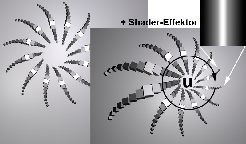 Wenn Sie jetzt denselben Shader-Effektor auch diesem zweiten Klon-Objekt zuordnen, erhalten Sie den rechts abgebildeten Zustand. Sie erinnern sich: u verläuft entlang des Radius, womit Start- und Endpunkt des abgebildeten Farbverlaufs zusammenfallen (1. Klon: u=0, letzter Klon: u=1).