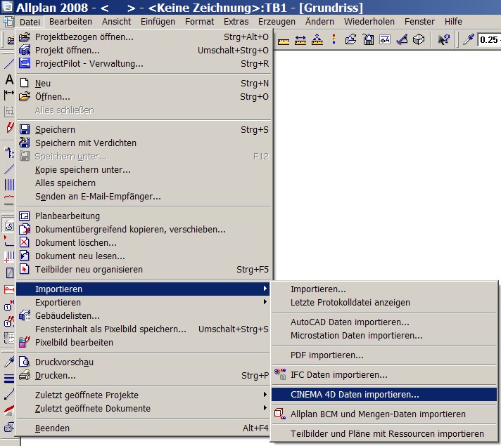 In Allplan wählen Sie dann Hauptmenü: Datei/Importieren/Cinema 4D Daten importieren: