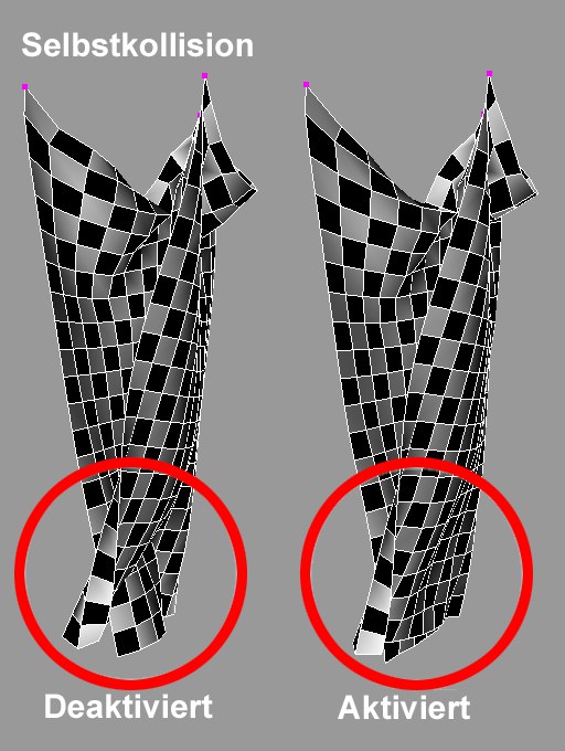 Wie der Name bereits andeutet, kann mit dieser Option die Kollision des Stoffobjekts mit seinen eigenen Punkten kontrolliert werden. Dies verhindert, dass während des Abspielens der Simulation die Oberfläche des Stoffes sich selbst durchdringt. Das Abspielen im Editor wird hierdurch verlangsamt, denn die Kleidungsengine muss mehr Berechnungen durchführen. Wirken extreme Kräfte auf das Stoffobjekt, kann es trotz aktivierter Selbstkollision noch zu Durchdringungen kommen. Die zusätzlich oder ersatzweise aktivierte Selbstabstoßung kann helfen, dies zu verhindern.