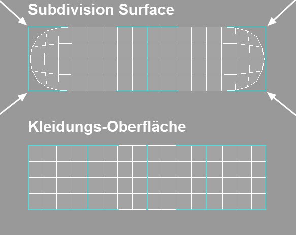 Da Kleidung nur auf polygonale Objekte angewendet werden kann, muss das Kleidung-Objekt vor dem Rendern geglättet werden. Mit Cinema 4Ds Subdivision Surfaces kann eine polygonale Geometrie geglättet oder so unterteilt werden, dass das Renderergebnis eine glatt aussehende Oberfläche ist. Allerdings kann die Anwendung eines Subdivision-Surface-Objekts auf ein Kleidung-Objekt unerwartete Ergebnisse bringen, denn die Geometrie des unterteilten Objekts verläuft nicht immer durch die Punkte des Käfig-Objekts. Das kann dazu führen, dass der Stoff Kollisionsobjekte durchdringt, wenn er auf diese Weise unterteilt wird. Das Kleidungs-Oberflächen-Objekt hingegen sorgt dafür, dass das Kleidung-Objekt immer die Punkte des Käfig-Objekts berührt, durch das es unterteilt wird. Der Grund, dass dieses Verhalten für ein Stoffobjekt notwendig ist, liegt in der simplen Tatsache, dass Stoff sich normalerweise in unmittelbarer Nähe des Kollisionsobjekts befindet. Das Verwenden von Subdivision-Surfaces würde dem Charakter oder dem Kollisionsobjekt erlauben, durch das unterteilte Stoffobjekt zu dringen.