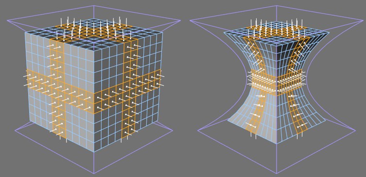 Ein durch ein Bulge-Objekt verformter Würfel. Links