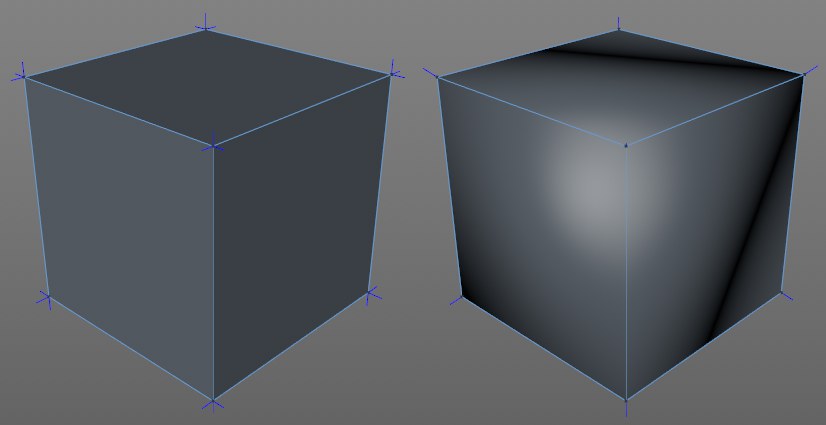 Diese Vertex-Normalen werden beim Shading/Rendern für jeden sichtbaren Oberflächenpunkt ausgewertet und an dieser Stelle interpoliert, um eine weiche, homogene Schattierung zu erreichen.