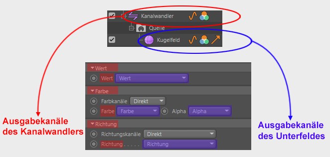 Diese Ebene verwendet Unterfelder (klappen Sie "Kanalwandler" auf und platzieren Sie Felder unter "Quelle"), nimmt einzelne Kanäle (Wert, Farbe, Richtung oder sogar Komponenten davon) dieses Unterfelds und konvertiert diese in beliebige andere. So kann z.B. die Farbkomponente "Rot" des Unterfeldes herangezogen werden, um den Kanal "Wert" des Kanalwandlers zu steuern.
