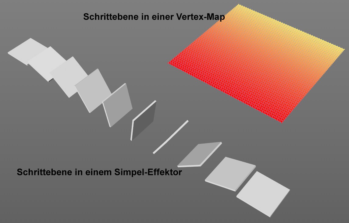 Die Schrittebene erzeugt Werte zwischen 0 und 1, die in den entsprechenden Felderlisten (z.B. bei Effektoren oder Deformern) mit anderen Feldern und Modifikatorebenen gemischt werden können.