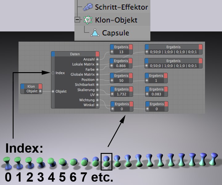 Mit Hilfe dieses Nodes können Sie alle relevanten Daten der folgenden klonerzeugenden Objekte (unter