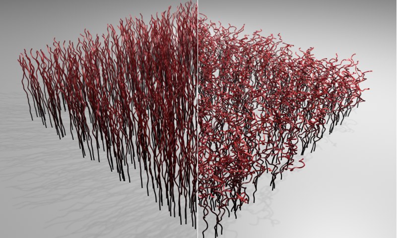 Dieser Materialkanal ähnelt Kräuseln. Er sorgt eben falls durch Einbringen eines Noise dafür, dass die einzelnen Haare chaotisch ihre Richtung ändern. Allerdings bleibt der grobe, durch die Guides vorgegebene Haarverlauf zumindest teilweise erhalten (bei Kräuseln kann sich die Haarform völlig ändern und in alle Richtungen weisen).