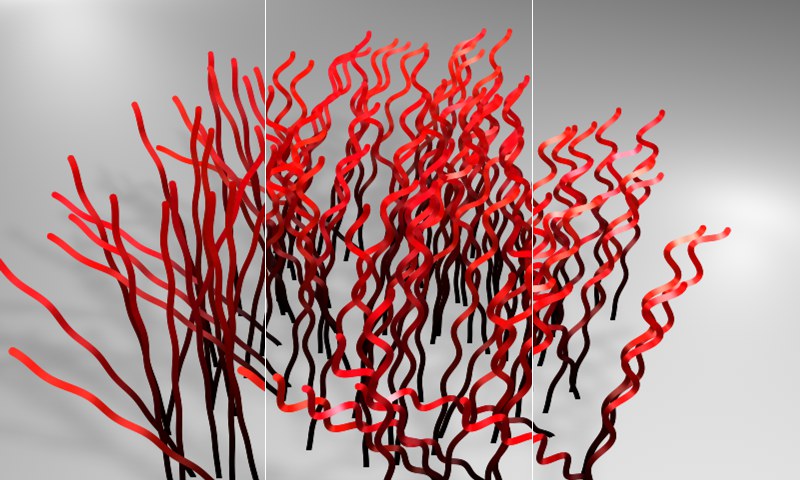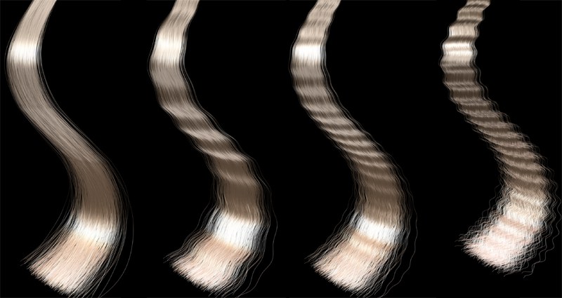 Diese Werte geben – getrennt nach X- und Y-Anteil – die Frequenz der Schwingungen, oder anders gesagt, die Anzahl der Wellen im Haar an. Bei der Abbildung unten mit den Haarsträhnen sind die mittleren beiden Strähnen mit unterschiedlicher Frequenz berechnet.