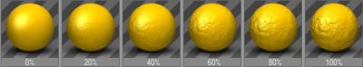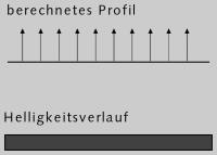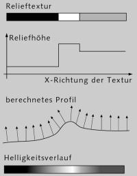Diese Höhenwerte werden in ein Profil umgerechnet, dessen Steigung die Neigung der Normalen-Vektoren beeinflusst. Obwohl die Oberfläche eigentlich glatt ist, wird durch die Neigung der Normalenvektoren eine scheinbar dreidimensionale Oberfläche mit reliefartiger Struktur berechnet, deren Helligkeitsverlauf im Bild unten wiedergegeben ist.