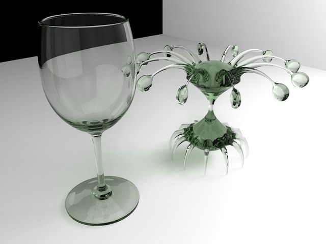 Der beste Weg, um flüssigkeitsgefüllte Gläser zu modellieren, ist das getrennte Modellieren von Flüssigkeit und Glas als eigenständige Volumina. Dabei sollte die Flüssigkeit in das Glasobjekt hineinragen. Für die üblichen rotationssymmetrischen Gläser (Modellieren durch Splines, die jeweils in einem Lathe-Objekt platziert werden) sieht das in etwa so aus: