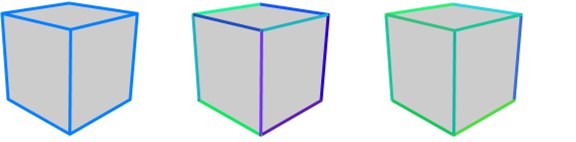 Hier kann das Rendering der Linien kontrolliert werden, also ob und wie die Linien beschnitten werden, wenn Teile des Objektes außerhalb des Bildbereiches liegen. Ist die Option deaktiviert, werden die Eigenschaften der Linien über den Bildrand hinaus weitergeführt (mittlerer Würfel). Ist sie aktiv, werden die Eigenschaften so angewendet, dass sie in den sichtbaren Bildausschnitt passen (rechter Würfel). Beachten Sie, wie der mittlere Würfel fast kein Grün mehr zeigt, während der rechte den kompletten Verlauf von Grün nach Blau besitzt.
