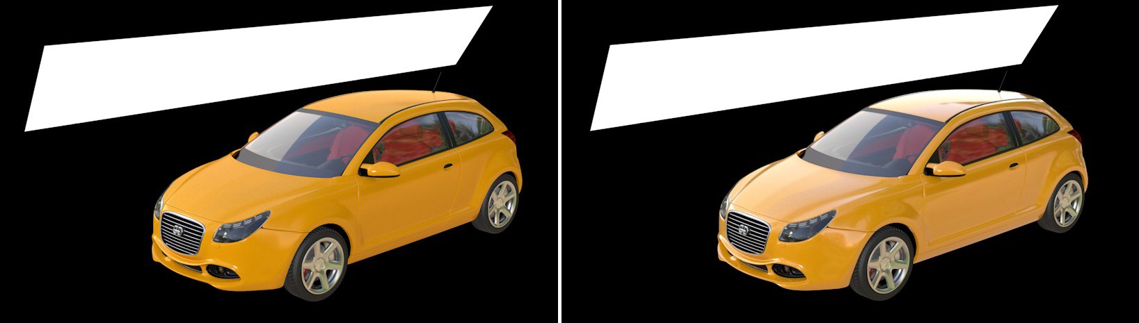 Dieser Materialkanal berechnet eine zusätzliche, in der Regel transparente Spiegelungsschicht, die z.B. für lackierte oder glänzend beschichtete Oberflächen verwendet werden kann. Da diese Spiegelungsschicht immer durchsichtig ist, stehen auch nur dielektrische Presets zur Verfügung. Die "Beschichtung"-Spiegelung liegt stets über bzw. auf der "Spiegelung"-Ebene des Materials.