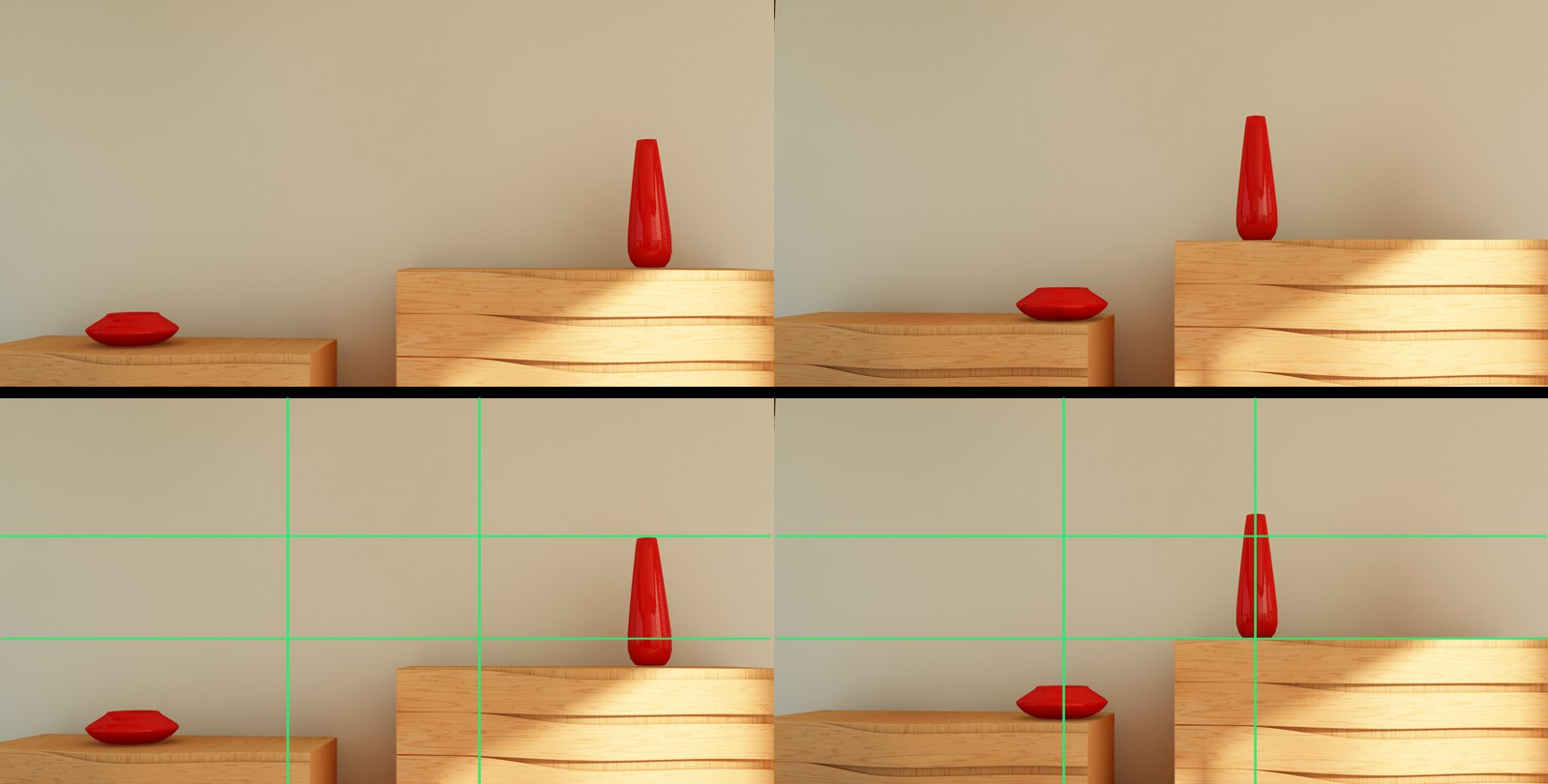 Das heisst jetzt nicht, dass Sie sämtliche Gegenstände in Ihrem Projekt stur nach diesen Linie ausrichten müssen (was meist ja auch gar nicht sinnvoll möglich ist), aber oft hilft es schon, ein markantes Objekt auf eine Linie oder einen derer Schnittpunkte zu legen (das muss gar nicht mal durch Verschieben der Objekte geschehen, sondern kann auch einfach durch Drehen oder Zoomen der Kamera passieren). Das Ergebnis wird subtil einfach besser wirken.
