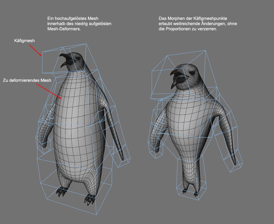 Der Mesh-Deformer kann auch zusätzlich zur Joint-Deformation wirken, indem das hochaufgelöste Mesh (gesteuert durch die Joints) zusätzlich mittels des niedrig aufgelösten Käfigs (der der Mesh-Bewegung folgt) deformiert werden kann. Deformationen können dann an jeder gewünschten Position hinzugefügt werden. Damit lassen sich z.B. sehr komplexe Stauch- und Dehn-Effekte realisieren.