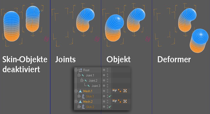 Wählt man diese Option, werden stattdessen die Koordinaten des Charakters benutzt. Bewegt man also den Charakter von den Joints weg, wird sich der Charakter auch bei aktiviertem Skin-Objekt tatsächlich von den Joints entfernen. Das hat aber keinen Einfluss auf die eigentliche Verformung. Diese findet weiterhin statt, nur eben versetzt zu den Joint-Objekten. Auf diese Art kann man also den Charakter animieren, während sein virtuelles Skelett neben ihm steht, was mitunter sehr hilfreich sein kann. Mit Hilfe dieser Option lassen sich aber auch mehrere Charaktere mit nur einem Rig animieren. Wollen Sie also mehrere Charaktere Cancan tanzen lassen, kopieren Sie einfach Ihr Charakter-Mesh (inklusive Wichtung Tag) mehrere Male und platzieren Sie diese nach Belieben in Ihrer Szene. Duplizieren Sie dabei nicht Ihre Joint-Hierarchie. Stellen Sie sicher, dass das Skin-Objekt auf alle wirken kann, also alle Meshs gemeinsam mit dem Skin-Objekt unter einem gemeinsamen Überobjekt gruppiert sind und wählen Sie die Option Objekt aus. Nun werden alle Kopien sich genau wie Ihr Original-Charakter mit nur einem Rig animieren lassen, aber ihre Position-, Winkel- und Größeneinstellungen beibehalten! Natürlich können Sie die Kopien anschließend beliebig verändern.