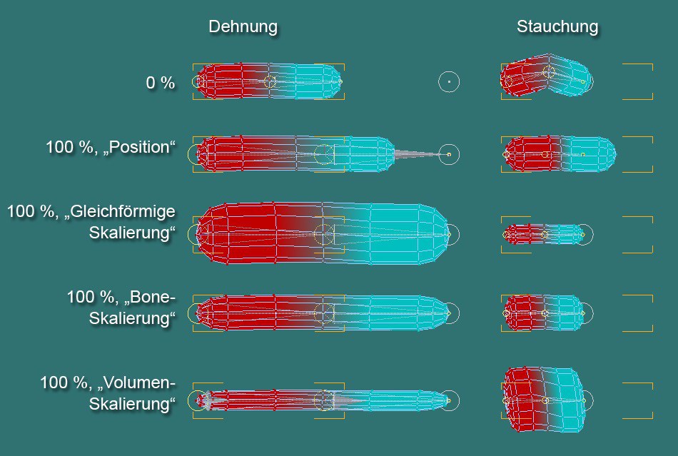 Auf der Abbildung können Sie gut die unterschiedlichen Auswirkungen der verschiedenen Typen sehen. Volumen skalieren entspricht dabei dem Verhalten der traditionellen Animationstechnik.