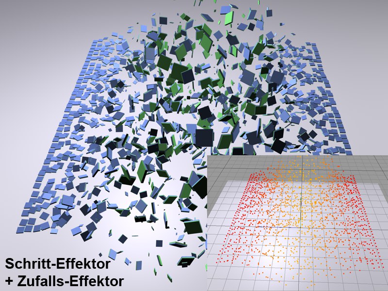 Wie Sie sehen, erfolgen jetzt die Positions-, Skalierungs- und Winkeltransformationen (wenn gewünscht aber auch jeder anderen Transformation) des Zufalls-Effektors gemäß der durch den Schritt-Effektor vorgegebenen Wichtung.
