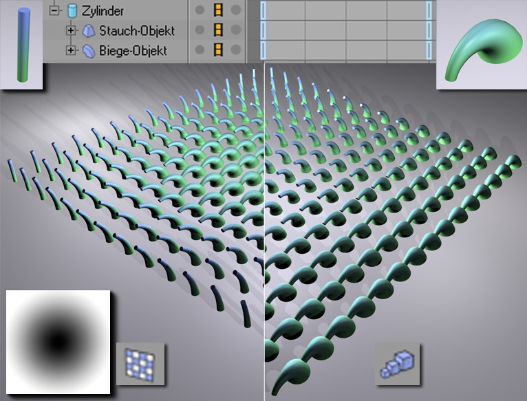 In obiger Abbildung wurde ein Stauch- und ein Biege-Objekt von Bild 0 bis Bild 20 animiert. Bei beiden Effektoren wurde jeweils ein Zeit Offset von 20 definiert, d.h. die Effektoren verteilen die zeitlichen Klonzustände entsprechend der Grausstufenverteilung (Shader-Effektor) bzw. von Klon 0 bis zum End-Klon (Schritt-Effektor) oder woher auch immer der entsprechende Effektor seine Eingangswerte bezieht.