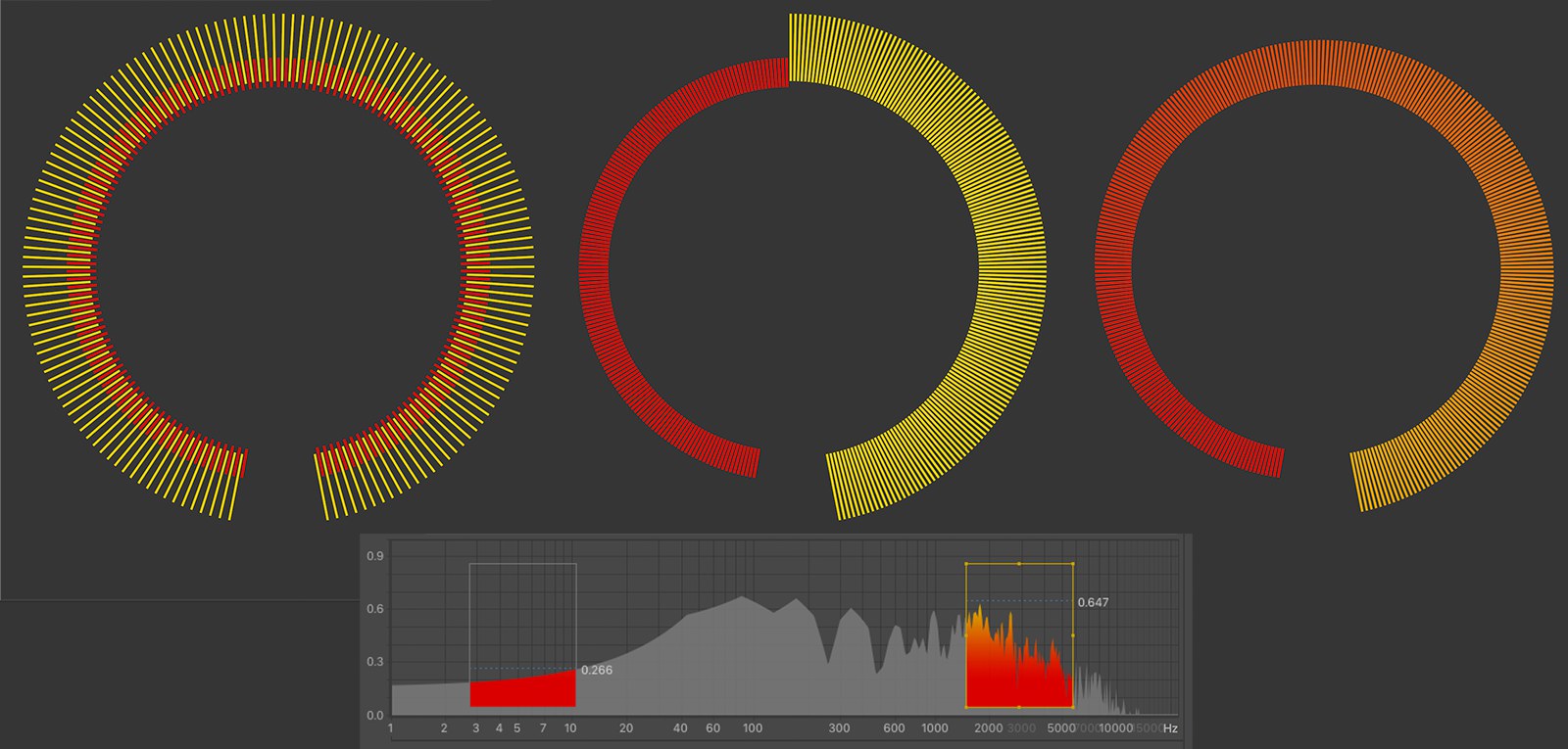 Im Frequenzgraphen sehen Sie den aktuellen, mit jedem Animationsbild neu berechneten Frequenz-/Lautstärkeverlauf. Die darin befindlichen Rechtecke sind die sogenannten "Abtastbereiche". Diese decken jeweils einen bestimmt Frequenz-/Lautstärkebereich ab, anhand dessen der Effektor Lautstärkewerte ermittelt, um wirken zu können. Bei den Samplingarten Spitze und Durchschnitt werden die ermittelten Wirkungen nummerisch eingeblendet.