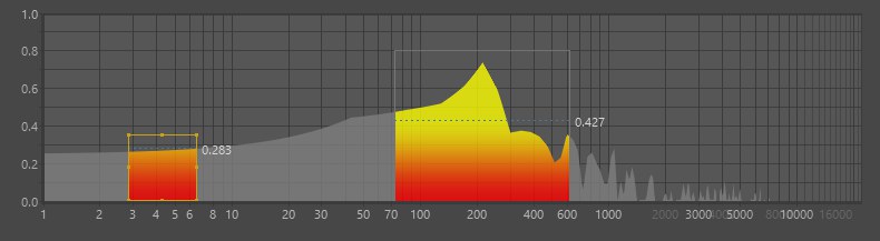 Selektierte Abtastbereiche zeigen ihre Eigenschaften im Untertab "Abtastbereicheigenschaften" an. Ein selektierter Abtastbereich zeigt diverse Anfasser, mit denen der Frequenz- und Lautstärkebereich angepasst werden kann. Sind mehrere Abtastbereiche selektiert, zeigt sich ein gemeinsamer Anfasser, mit dem Sie alle selektierten Abtastbereiche auf einmal bearbeiten können. Zum Verschieben klicken Sie in die Selektion und ziehen mit gedrückter Maustaste.