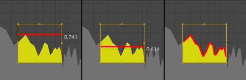 Darüber hinaus zeigt jeder Abtastbereich (sofern bei SamplingSpitze oder Durchschnitt definiert ist), den aktuell ermittelten Lautstärkewert an, anhand dessen der Effektor wirkt.