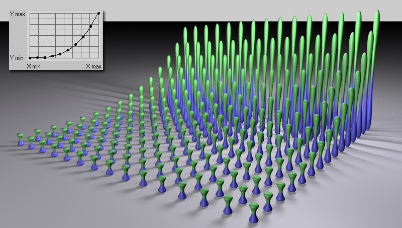 Mit diesem Funktionsgraphen (s.a. Funktionsgraphen) beeinflussen Sie die Interpolation zwischen erstem und letztem Klon. Der Graph gibt dabei den Verlauf des Effektoreinflusses vom ersten zum letzten Klon an.