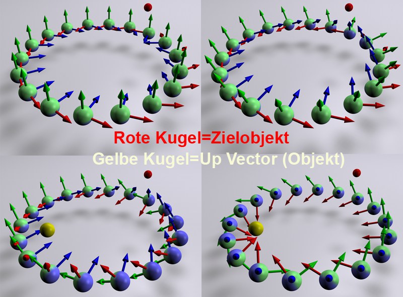 Ist diese Option aktiviert, zeigt die Z-Achse des Klons immer genau auf das Ziel-Objekt, ist sie deaktiviert, bleibt die Pitch-Drehrichtung unverändert. Außerdem können Sie einen Up-Vektor einstellen.