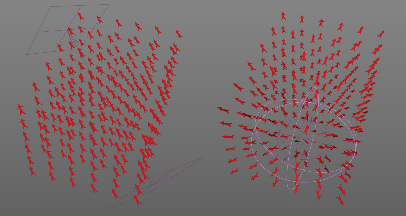 Felder können also direkt eine Richtung (bzw. einen Vektor) vorgeben. Bei den gängigen Formfeldern wie Linear- oder Kugelfeld verläuft diese Richtung immer von maximaler zu minimaler Wirkung. D.h. beim Linearfeld ergibt sich dieselbe Richtung, während beim Kugelfeld die Richtung vom Kugelmittelpunkt nach außen zeigt.