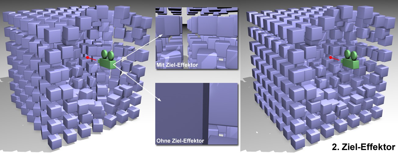 Sollten Sie bei dieser Gelegenheit die Ausrichtungen der einzelnen Klone stören, die sich ja jeweils zur Kamera drehen, so denken Sie daran, dass Sie einen zweiten Ziel-Effektor auf das Klonkonglomerat wirken lassen können (in der Abbildung rechts), der beispielsweise auf ein weit entferntes Null-Objekt zielt. Dieser 2. Ziel-Effektor sollte dann in der Effektoren-Liste an 2. Stelle angeordnet sein. Die Klone weichen dann immer noch der Kamera aus, drehen sich allerdings nicht mehr zu ihr, da der 2. Effektor (wird nach dem ersten abgearbeitet) das Sagen über die Drehung hat.