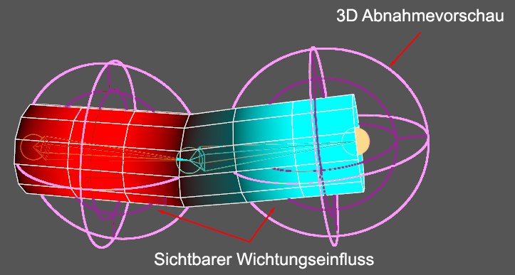 Beachten Sie, dass das alleinige Verschieben oder Drehen des Abnahme-Objekts das Mesh nicht verformt. Da Wichtungsabnahmen an Joints gebunden sind, können auch nur diese zur Mesh-Verformung herangezogen werden. Abnahme-Objekte als räumliche Abnahme legen fest, wo sich die Joint-Wirkung entfaltet. Obwohl sie frei und unabhängig von Joints platziert werden können, wird sich nur in Jointnähe ein Effekt ergeben (oder anders ausgedrückt: Meshpunkte sind an den Joint gebunden und das Abnahme-Objekte kontrolliert dessen Einfluss auf die Meshpunkte).