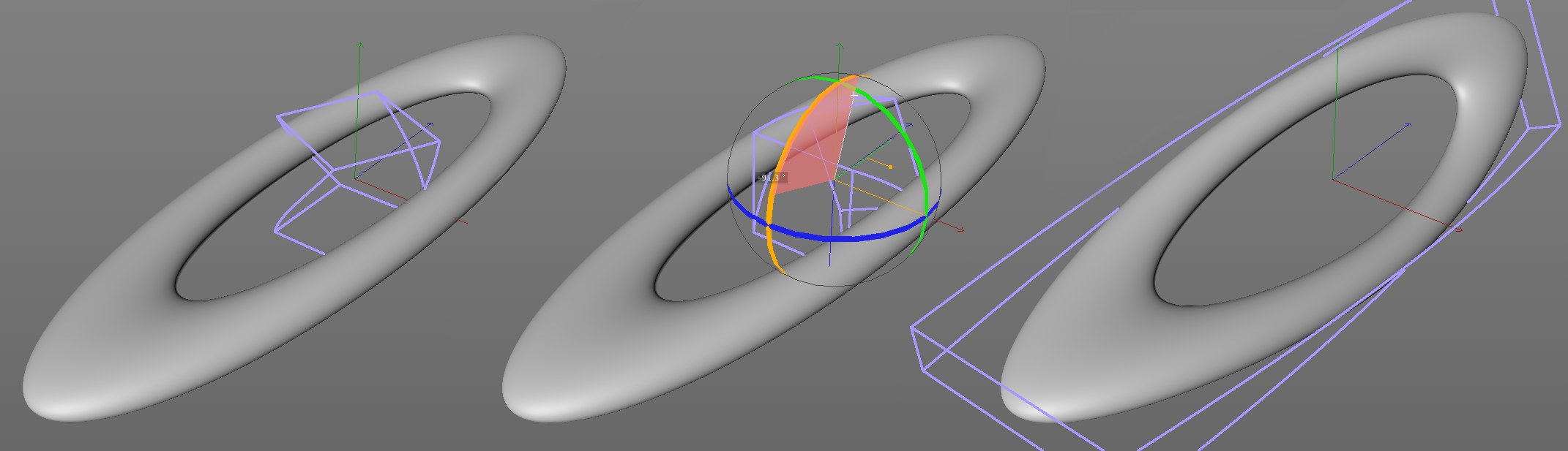 Darüber hinaus werden die Deformer-Objekte mit ihren Achsen an die nächstliegenden Achsen des Überobjekts angepasst, d.h. Sie drehen den Deformer interaktiv grob in die Richtung, in die er wirken soll, drücken auf den Button und der Deformer schnappt auf die nächsten Achsen ein (womit er auch gleichzeitig den Ursprung übernimmt).