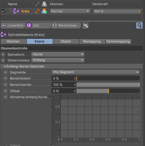 Die Felderliste hat die Fähigkeit, zusammengesetzte Elementeigenschaften anzuzeigen. Beispiel: Sie ziehen einen Kreis-Spline in die Felderliste. Die Ebene "Kreis" wird weiter unten im Dialog mit 5 Tabs angezeigt, wovon das Tab "Objekt" direkt vom Spline übernommen wird (sodass Sie bequem Kreiseinstellungen ändern können, ohne im Objekt-Manager den Kreis-Spline selektieren zu müssen). Das Tab "Ebene" enthält dabei die eigentlichen Einstellungen der Feldebenen-spezifischen Einstellungen. Die anderen Tabs "Mischen", Remapping" und "Farbremapping" sind allgemeine Felderlisten-Ebeneneigenschaften, deren Eigenschaften wiederum von anderen – unsichtbaren – Objekten (s.a. Andere Objekte) gestellt werden.
