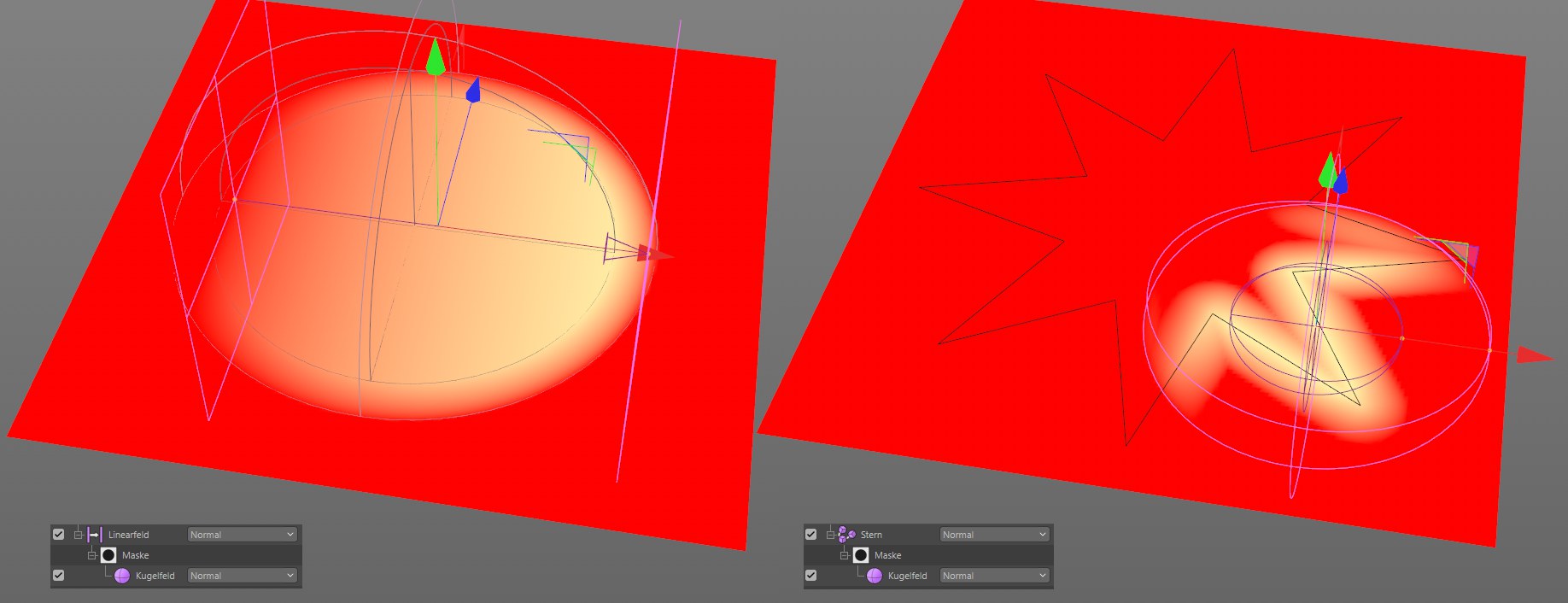 Linearfeld (links) bzw. einem Splinefeld (rechts) definiert, wobei jeweils ein Kugelfeld als begrenzende Maske