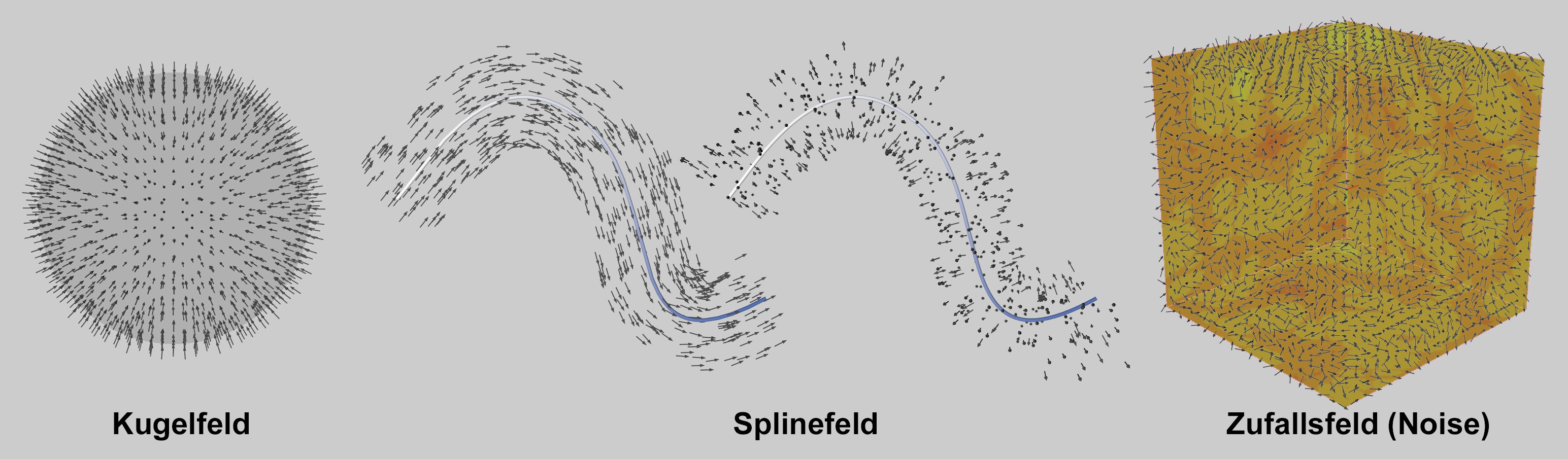 Das hier beschriebene Kraftfeld lässt sich mittels Feldern räumlich beliebig kontrollieren. Felder in der von der R20 gewohnten Weise ermitteln räumlich differierende Werte, die die Stärke von Effekten steuern (z.B. eine Verschiebung). Beim Kraftfeld werden diese Felder analysiert, um Richtungsvektoren zu errechnen.